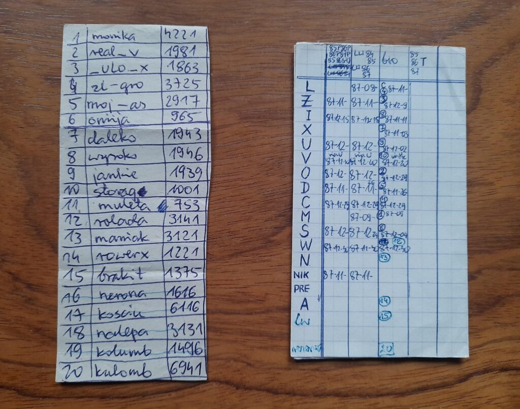 Na zdjęciu poniżej prezentujemy dwie odręczne notatki pochodzące z 1987 roku. Po lewej stronie – zestawienie 20 egzemplarzy Biorytmu, przygotowanych przez Marka Nikodemskiego i przeznaczonych dla regionalych struktur Solidarnosci podziemnej. Zestawienie zawiera opis sposobu przekierowania do procedury szyfrowania/odczytu – odmienny dla poszczególnych egzemplarzy Biorytmu. Po prawej stronie – zestawienie zawierające informacje, który egzemplarz Biorytmu został dostarczony do którego regionu Solidarności podziemnej, określonych na liście symbolami literowymi.