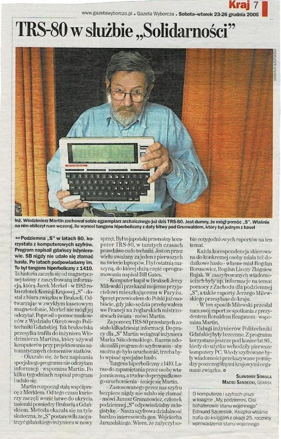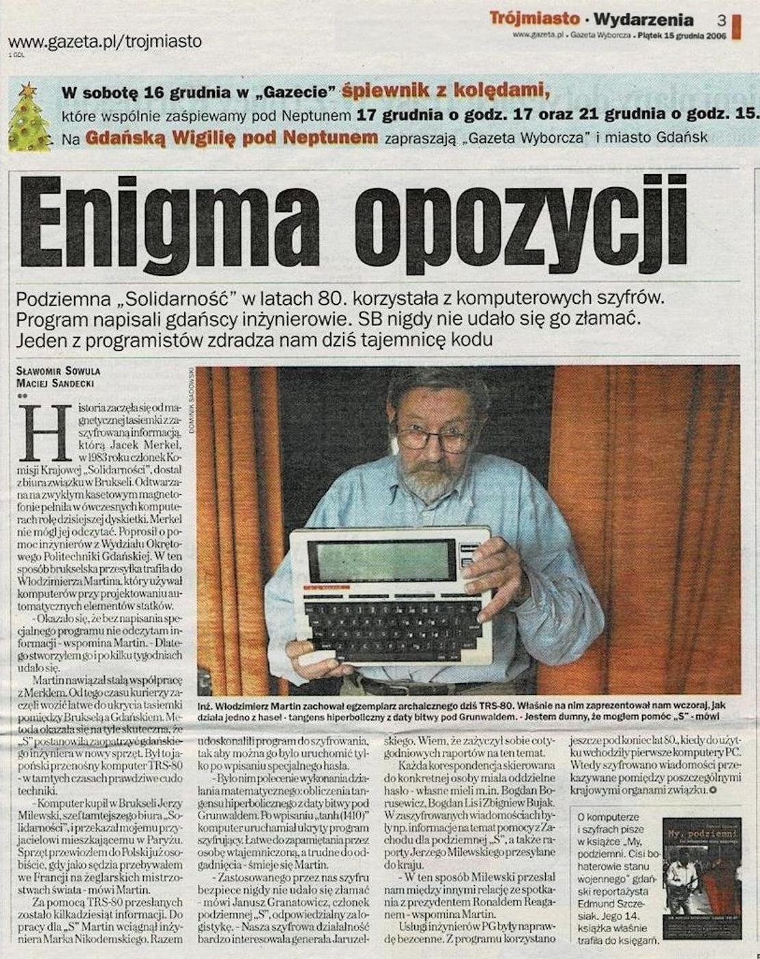 Służba Bezpieczeństwa była bezsilna wobec szyfrów Solidarności podziemnej nawet pomimo tego, że w maju 1986 roku w Warszawie udało im się przejąć komputer TRS-80 Model 100 z oprogramowaniem zawierającym dwie pierwsze wersje algorytmu szyfrującego. Przełom w łamaniu szyfrów Solidarności podziemnej nastąpił dopiero wówczs, gdy Służba Bezpieczeństwa zwróciła się o pomoc do Zarządu II Sztabu Generalnego Wojska Polskiego. Zadanie złamania szyfru Solidarności podziemnej zostało zlecone Oddziałowi XVI (Dekodażu) Zarządu II. Po wielu miesiącach pracy obie przejęte przez Służbę Bezpieczeństwa wersje algorytmu złamał oficer tego Oddziału, kapitan Krzysztof Polkowski, który na początku 1987 roku opracował instrukcję opisującą oba algorytmy oraz metodykę odczytywania korespondencji szyfrowanej tymi algorytmami. Instrukcję tę Zarząd II Sztabu Generalnego WP przekazał Służbie Bezpieczeństwa.